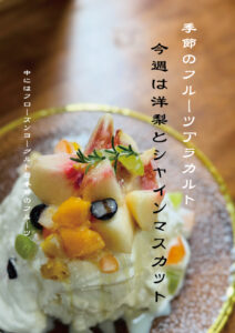 洋梨とシャインマスカットをメインに多種のフルーツ満載のケーキのようなかき氷と